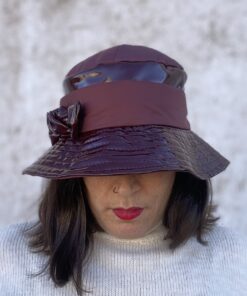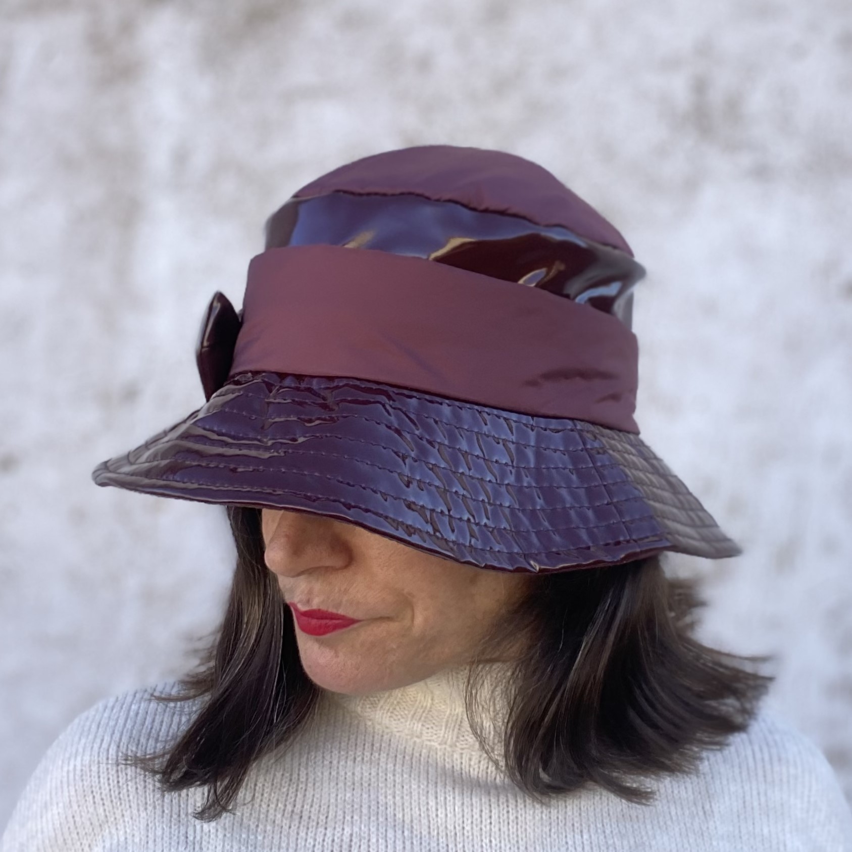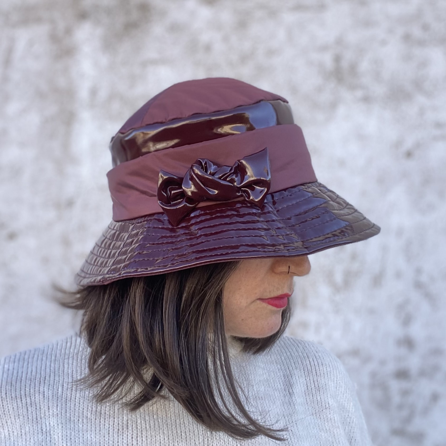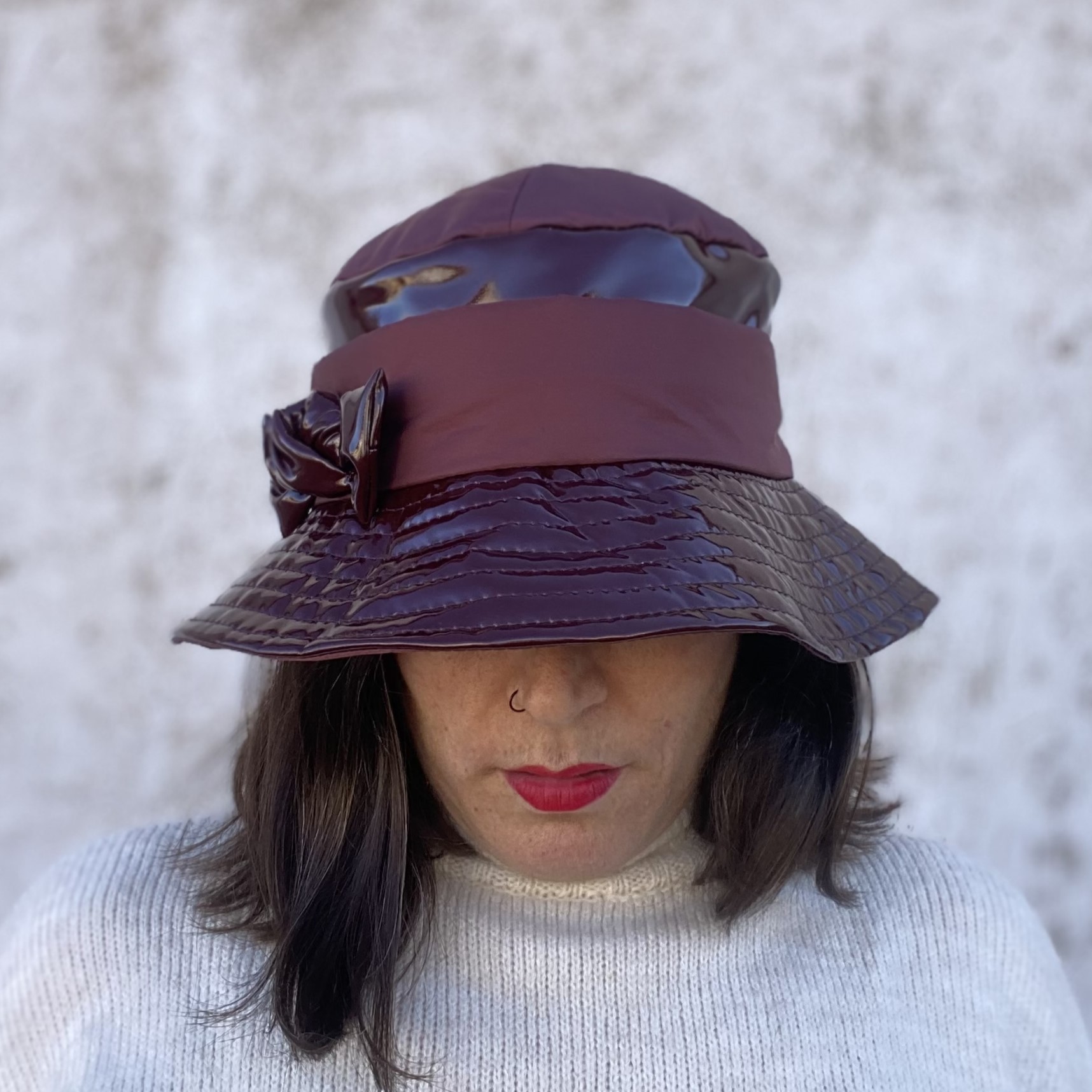 GORRO IMPERMEABLE EN COLOR GRANATE CON INTERIOR POLAR DECORADO CON LAZO. ES UN GORRO IDEAL PARA EL FRÍO O LA LLUVIA.